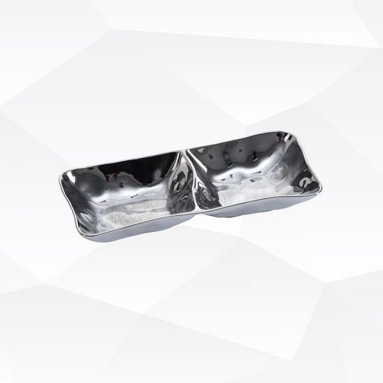 2 Section Server in Thin & Simple. Great for serving appetizers, desserts and sides! Serve chips and dip, an assortment of cookies or a duo of vegetables. This server also makes for a perfect nut and/or candy dish for any countertop! Crafted in stunning silver finish porcelain. Food safe, dishwasher safe, Oven safe to 550°. Tarnish and stain-free. Easy Care.