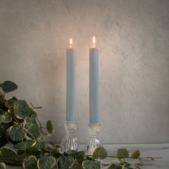 Due to popular demand, we have custom made a limited supply of 8 inch tall Slate Blue dinner candles. Perfect for sconces and candelabra with shorter chimneys, the 8 inch custom dinner candle features the same flexible adapter that the 11 inch does and fits securely into nearly any candle holder. Reservoir is same depth as 11 inch dinner candle and burns 5 - 6 hours before refill. Custom labor adds $2 to cost. Sold individually.