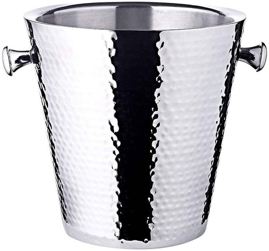 Elevate your entertaining experience with our sophisticated double wall insulated, hammered stainless steel with silver plate champagne bucket, complete with a sleek, modern stand. Designed for both function and style, this bucket keeps your favorite bottle perfectly chilled and within easy reach, making it ideal for upscale dinner parties, weddings, and celebratory events. The hammered texture adds a luxurious touch, while the sturdy pedestal base ensures stability and presence in any setting. Whether you’re toasting to a special occasion or adding a refined detail to your home bar, this champagne bucket with stand is the perfect statement piece. These pieces are Han