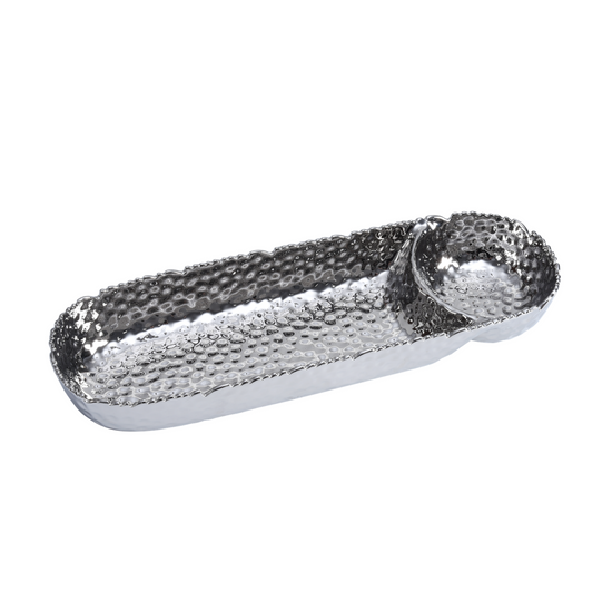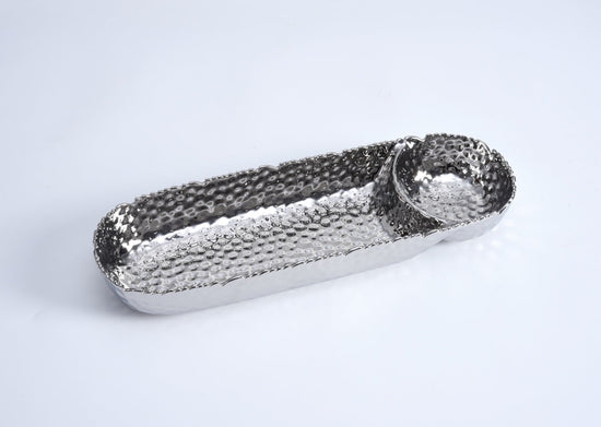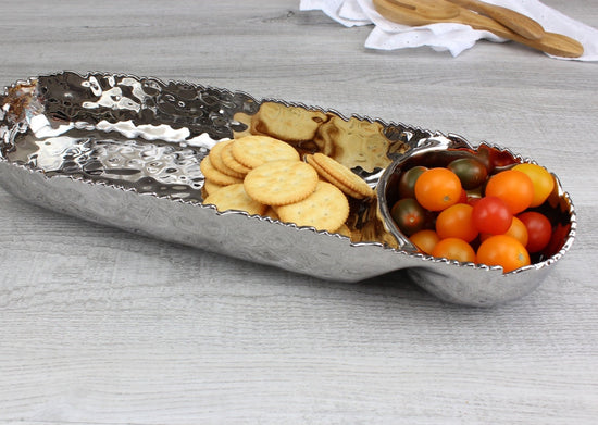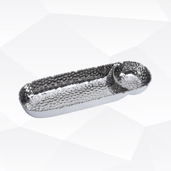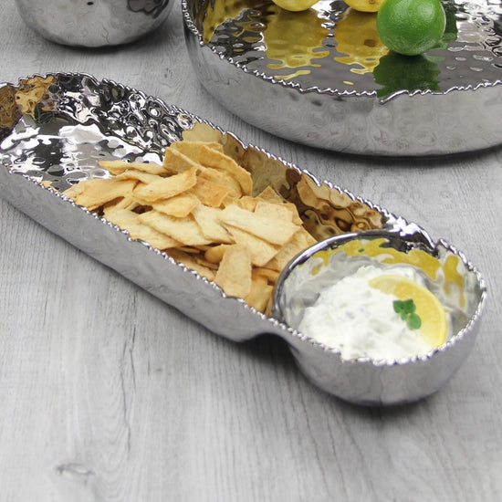 Chip and Dip in Millennium. Perfect for any dip combo – hummus and pita, salsa and tortilla chips, veggies and ranch or our favorite berries and whipped cream! This piece also makes a stunning display for sushi and soy sauce or crab cakes and tartar sauce. Striking and elegant silver tone titanium finished high-fired porcelain. Food safe, tarnish free, dishwasher safe, oven safe to 500°. Easy Care.