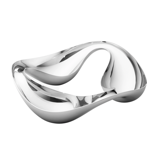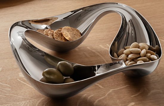 Seeming to almost capture movement, the striking organic shape of this stainless steel snack bowl makes it an eye-catching piece at any dinner party or social occasion. Flowing in a circular form that creates three distinct sections, the bowl forms a centrepiece that is perfect for serving nuts, dips, candies or other treats as it invites interaction and conversation.