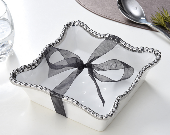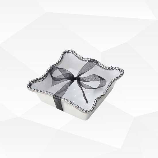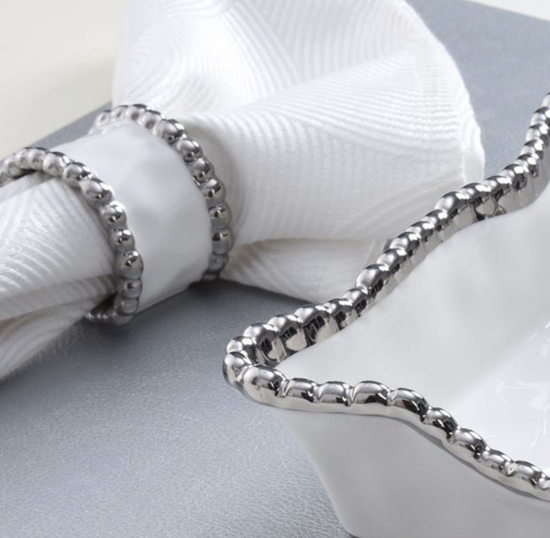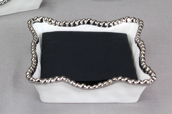 Cocktail napkin holder in Salerno. Add a touch of luxury and elegance with this magnificent napkin holder. Also great for serving up small pastries, sliced fruit and appetizers. Gleaming white porcelain with lustrous silver beads in titanium. Food safe, dishwasher safe, oven safe to 500°. Easy Care.