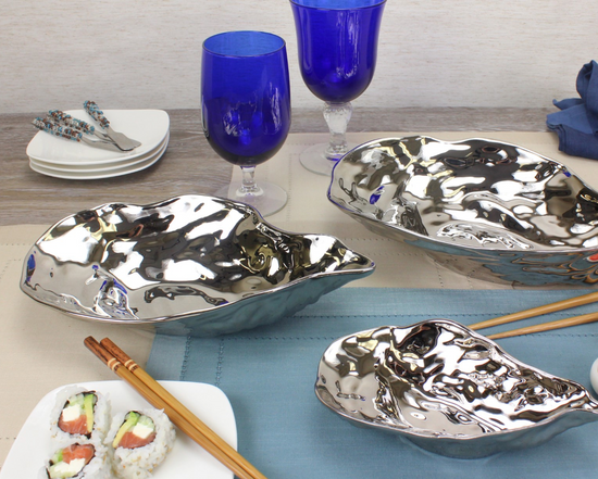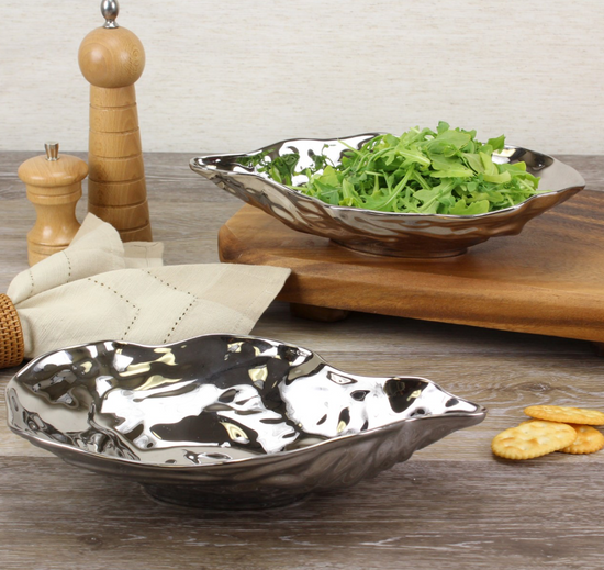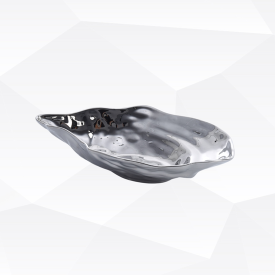 Medium Silver porcelain oyster shaped bowl with titanium exterior. Gorgeous natural shape of an oyster in a timeless and classic color combo is sure to amaze.
