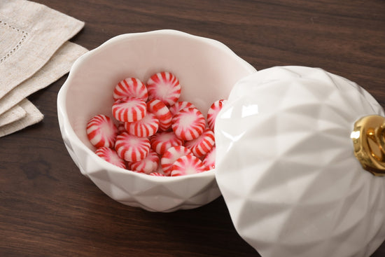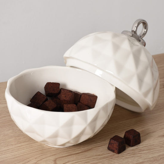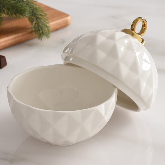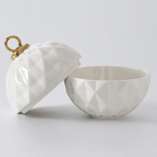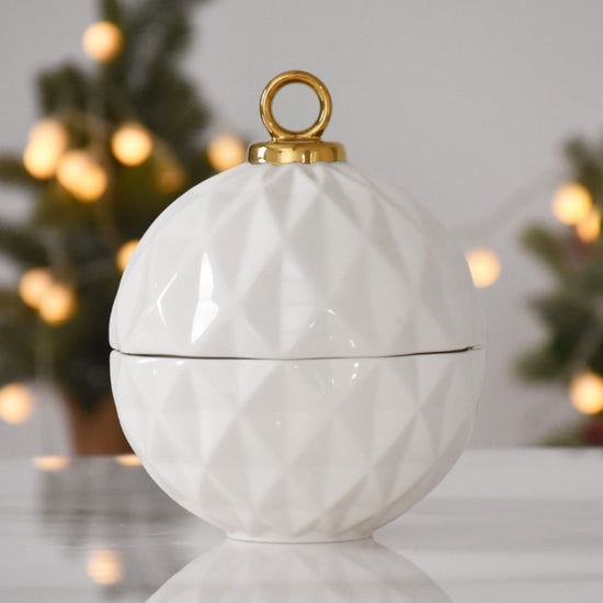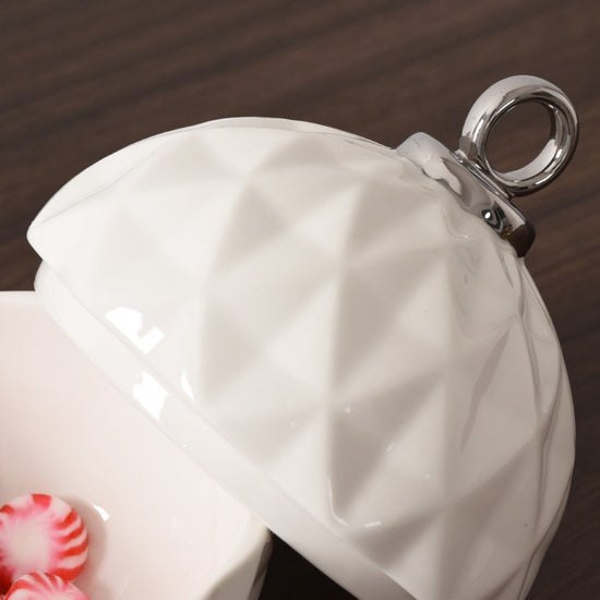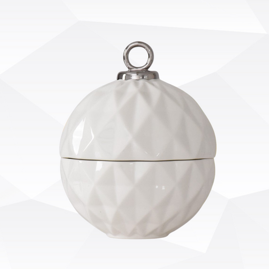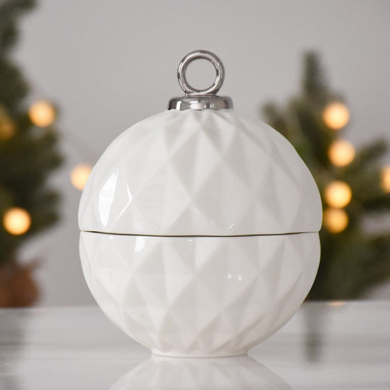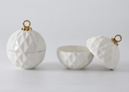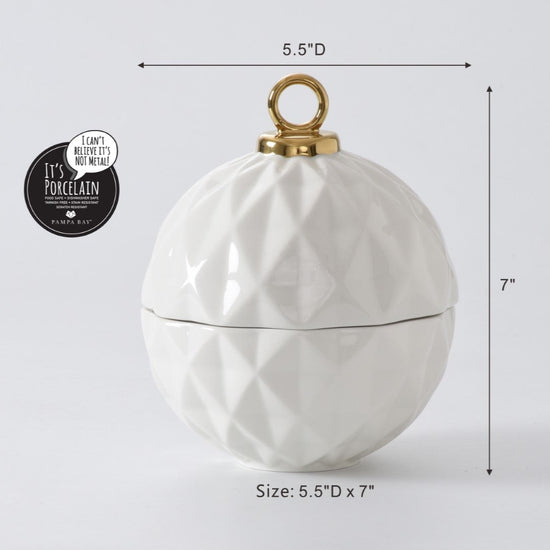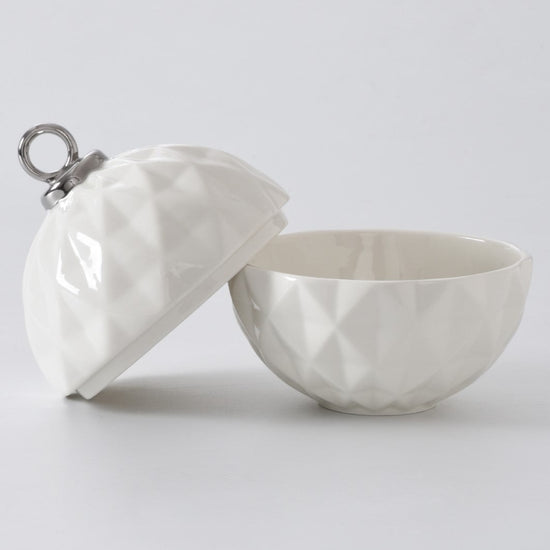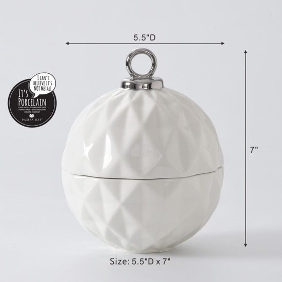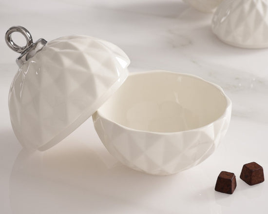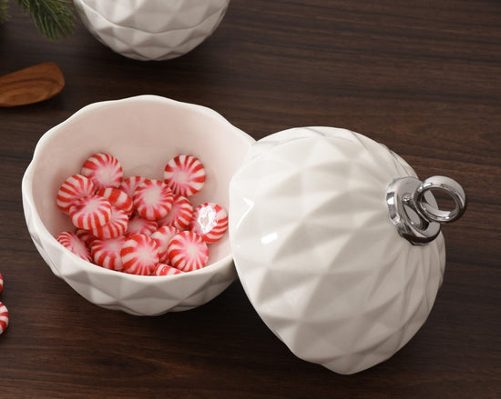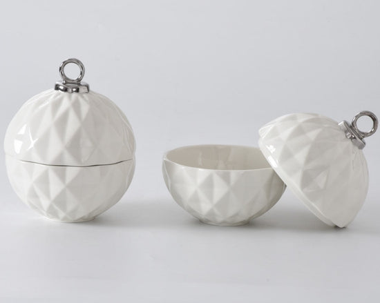 Behold the Small Ornament Bowl from our For The Holidays Collection! An absolute powerhouse for serving candies, nuts, fruit, or condiments! This festive bowl features an elegant ornament shape crafted from high-fired porcelain in stunning white and silver metallic finishes. A showstopper for your holiday gatherings, adding sophistication and style to your table