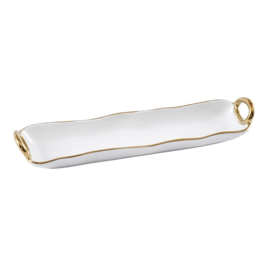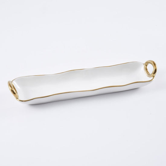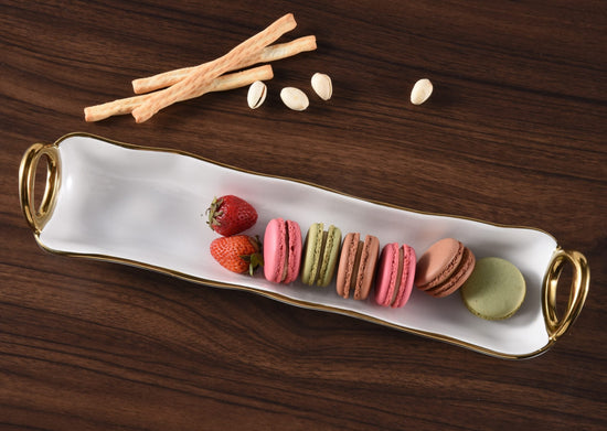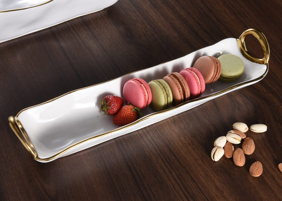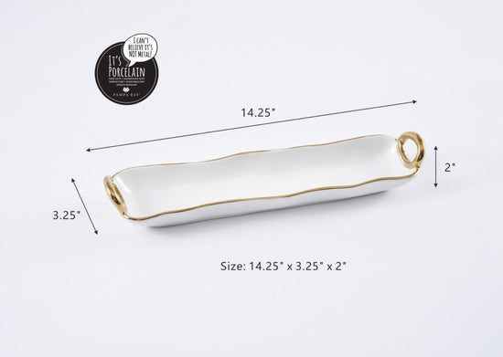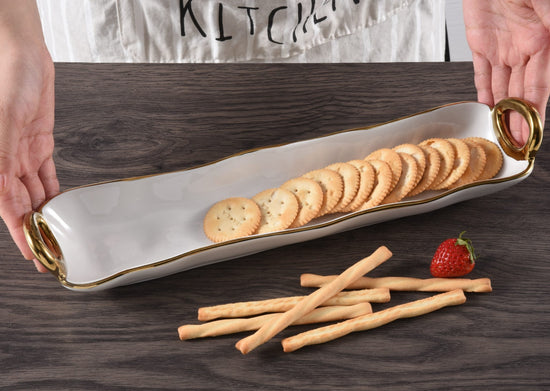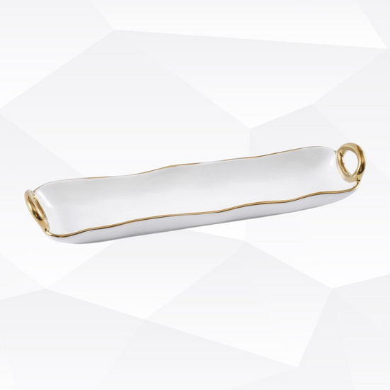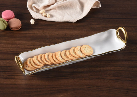 Introducing the Moonlight Cracker Tray—an impeccable choice for crackers, small cookies, and other delightful treats. Crafted from stunning white high-fired porcelain embellished with gold titanium, this tray exudes elegance, adding a touch of sophistication to your snack presentations.