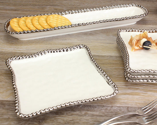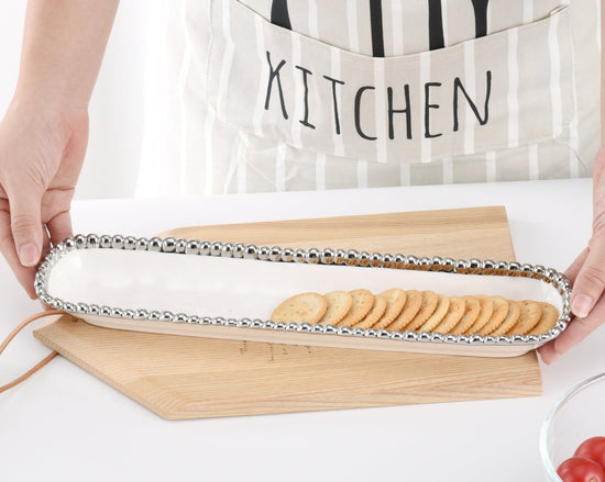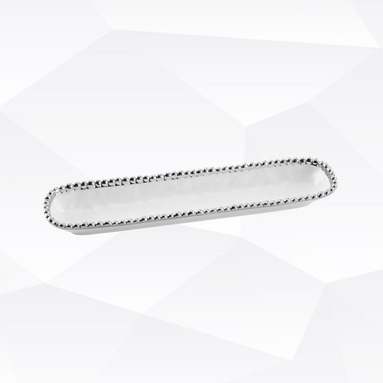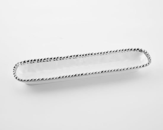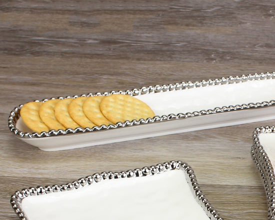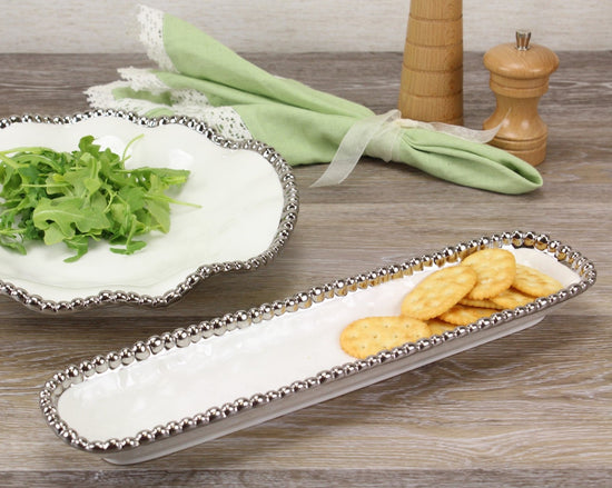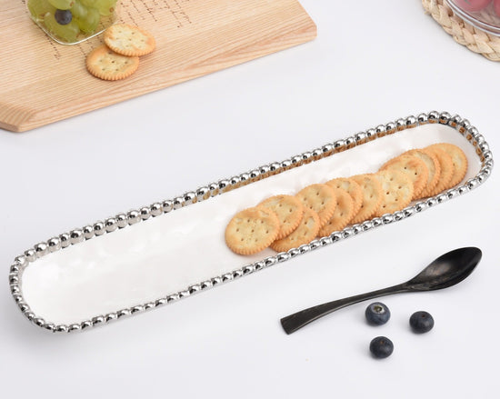 The Salerno cracker tray offers a perfect solution for presenting crackers, small cookies, or other delightful treats. Crafted from gleaming white porcelain adorned with lustrous silver beads in titanium, it exudes an elegant charm, elevating the presentation of your favorite snacks and enhancing the table setting.