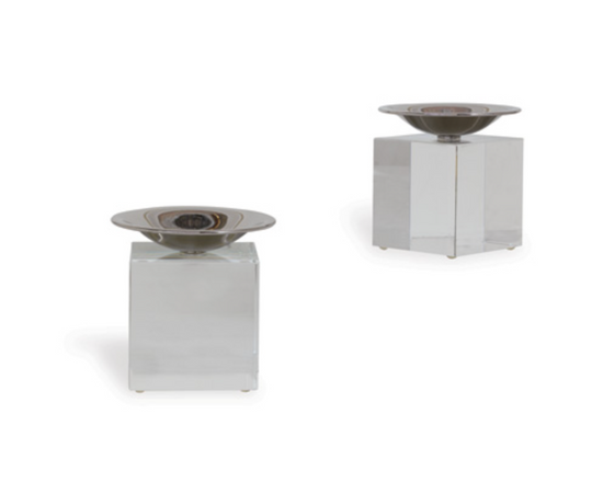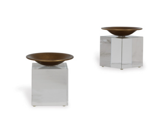 Modern solid crystal candleholders feature an Aged brass/Chrome candle cup. Round candle cup holds a 3" diameter pillar candle. Candles not included.