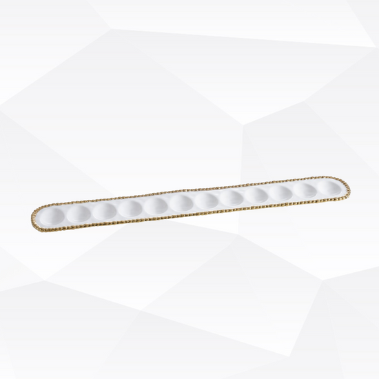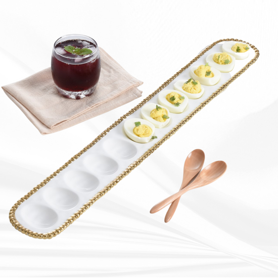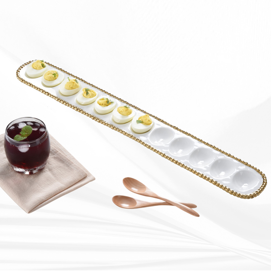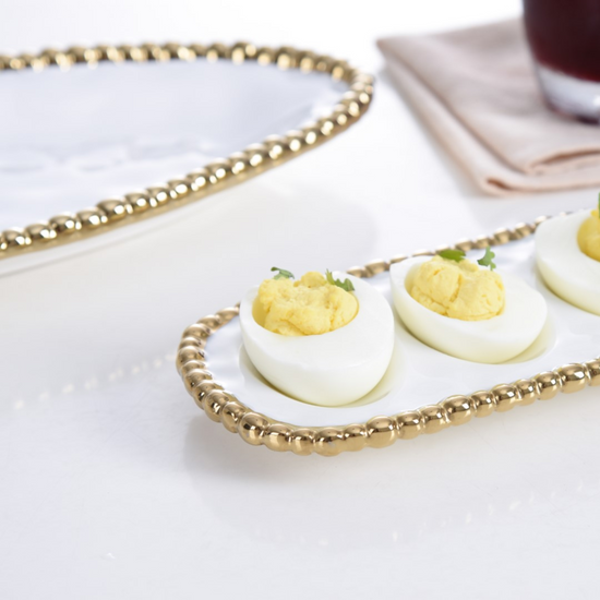 Deviled Egg Tray White/Gold. The perfect accompaniment to relaxed weekend brunches, annual Easter celebrations or a fun night in, our egg tray is a great centerpiece for more than just eggs! Use to display a dozen deviled eggs at brunch or your beautifully decorated Easter eggs.