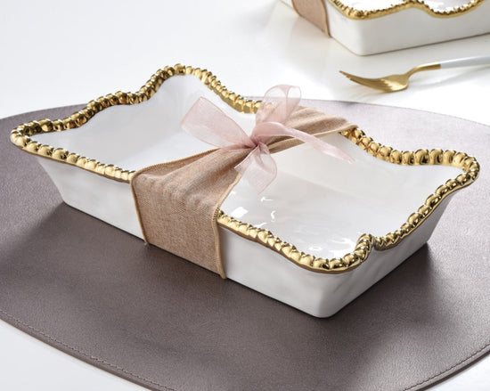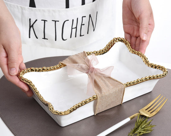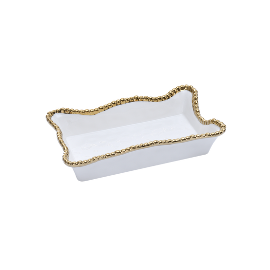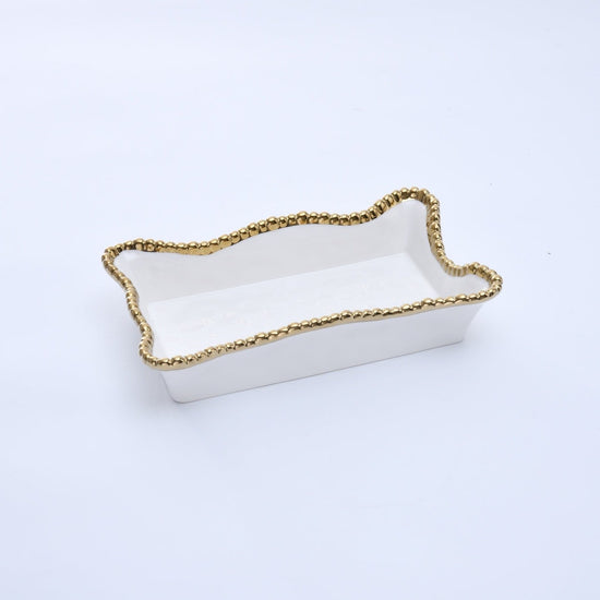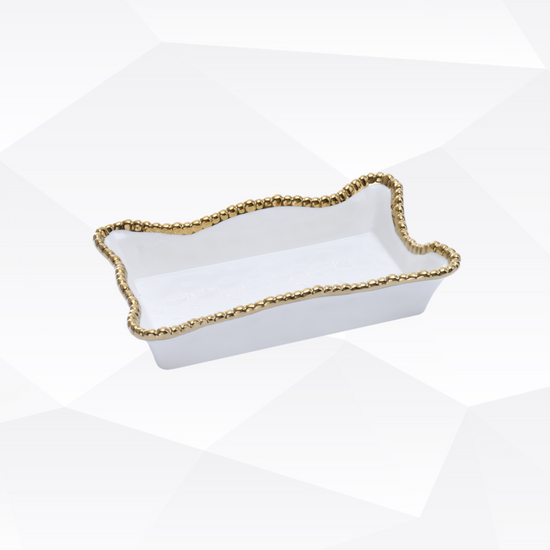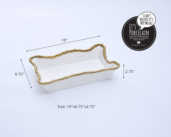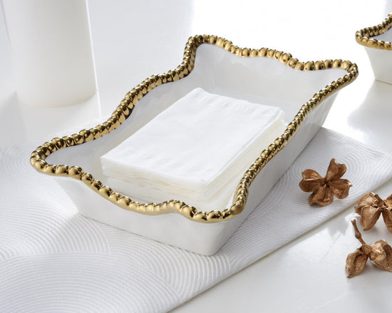 Experience opulence and sophistication with the Dinner Napkin/Guest Towel Holder in Golden Salerno. Elevate your setting by adding this magnificent napkin holder, perfect for neatly arranging rolled cloth or paper dinner napkins at your next buffet, or elegantly displaying rolled hand towels in a powder room. Additionally, it doubles as a stylish serveware piece, ideal for presenting small pastries, sliced fruit, and grilled vegetables. Crafted from gleaming white porcelain adorned with lustrous gold beads in titanium, this holder exudes a luxurious charm.