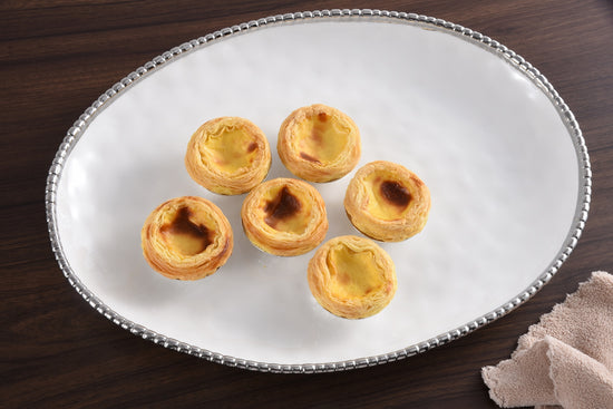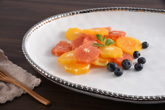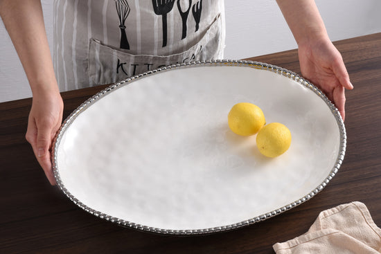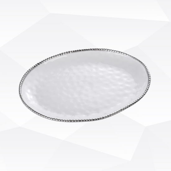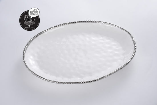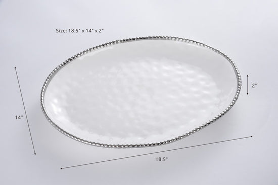 Present your delectable main courses or hearty sides in style with our generously sized Salerno Large Oval Platter, measuring over 18 inches in length. Crafted from exquisite gleaming white porcelain adorned with lustrous silver beads made of titanium, this platter not only enhances your dining experience but also serves as a charming dessert display for an assortment of delectable treats and sweets.
