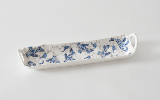 Cracker Tray in our Koi Collection. Perfect for crackers, small cookies and other small treats. The striking imagery of the koi combined with rich blue hues invoke a sense of harmony and serenity on this durable melamine piece. Great for your indoor and outdoor activities. Food safe, freezer safe, dishwasher safe. Easy Care.