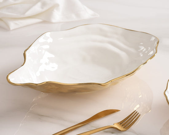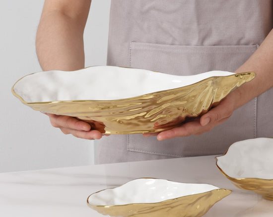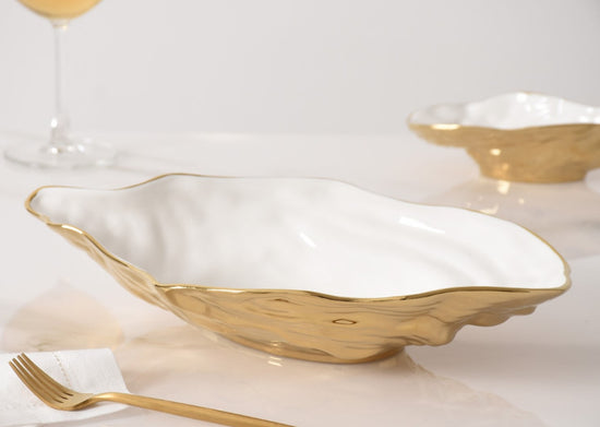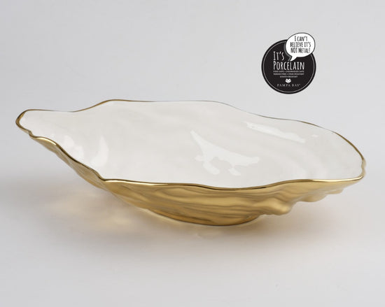 Large white porcelain oyster shaped bowl with golden exterior. Gorgeous natural shape of an oyster in a timeless and classic color combo is sure to amaze. Great for serving seafood favorites like shrimp, seafood salad, steamers or mussels. Or use it for guests to discard their empty clam/mussel shells! Striking and elegant gold finished high-fired porcelain with gleaming white interior.