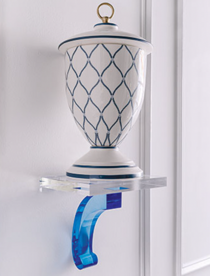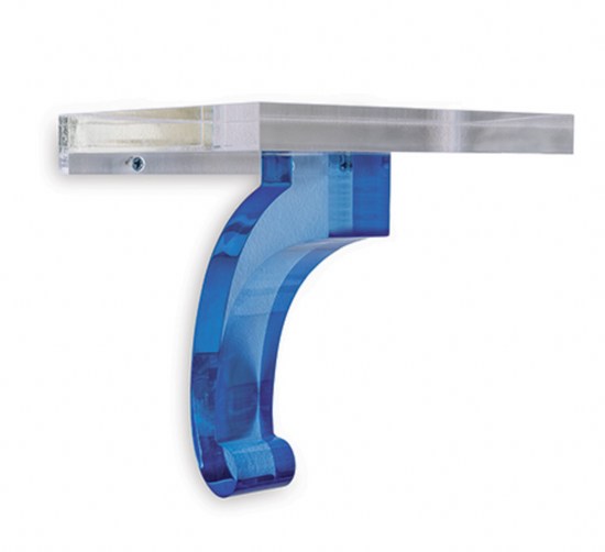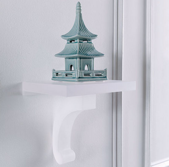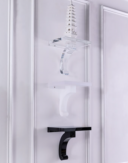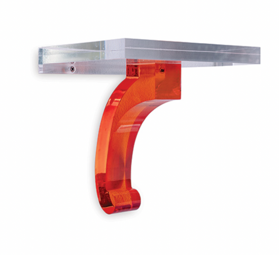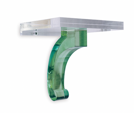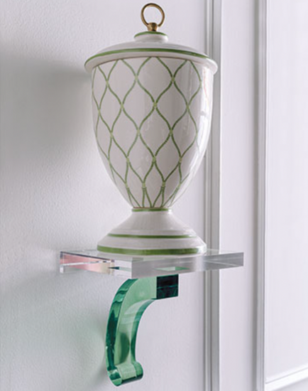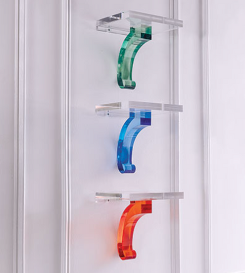 Our chic, solid lucite wall shelf that disappears on the wall--but has a pop of color with the bottom support in translucent green. The objet or jar is the feature when placed on this shelf. Predrilled holes on the bottom rail make mounting easy to the wall, and ever so discrete.