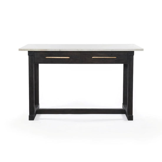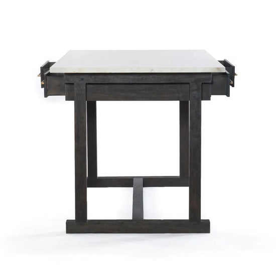 Coal-finished mango wood supports a top of polished white marble for a clean look with alluring contrast, plus brass drawer pulls for vintage vibes.