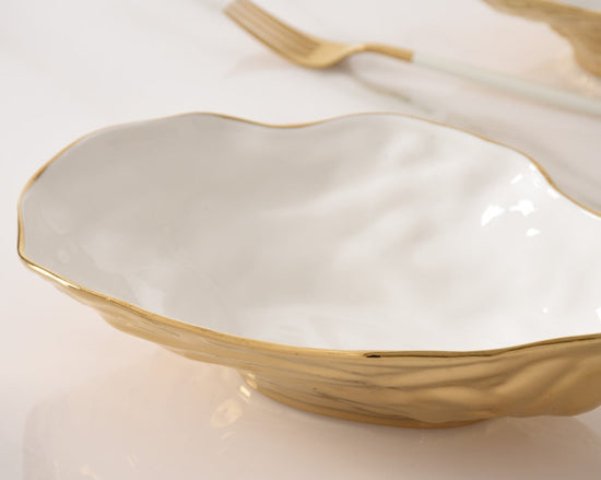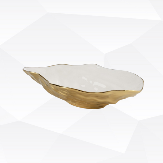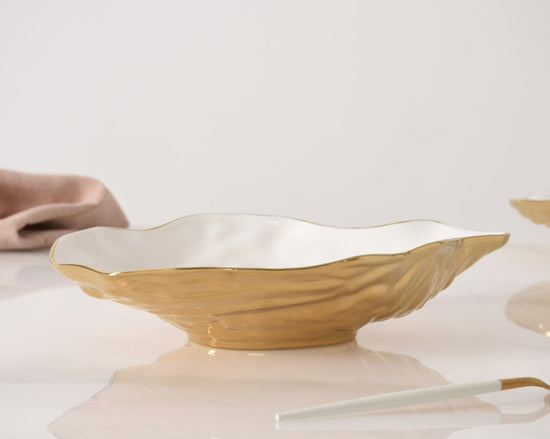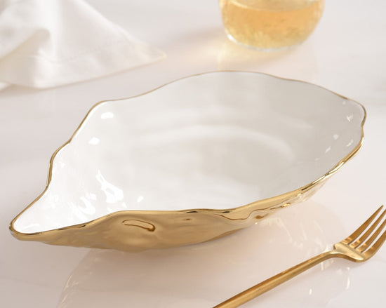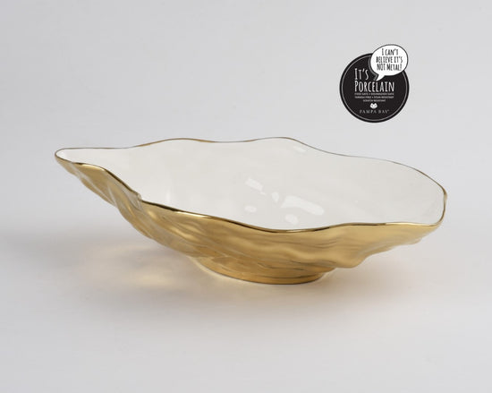Medium white porcelain oyster shaped bowl with golden exterior. Gorgeous natural shape of an oyster in a timeless and classic color combo is sure to amaze. Great for serving seafood favorites like shrimp, seafood salad, steamers or mussels . Or use it for guests to discard their empty clam/mussel shells! Striking and elegant gold finished high-fired porcelain with gleaming white interior.