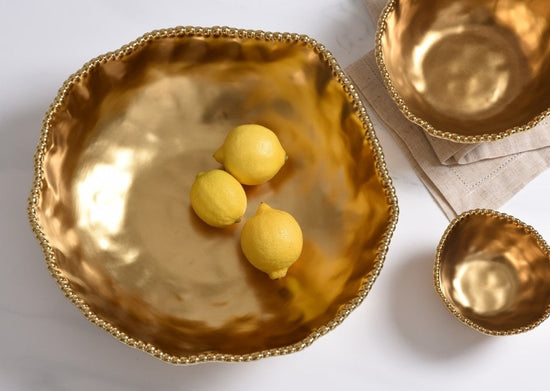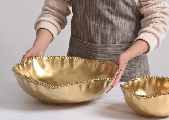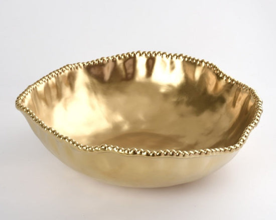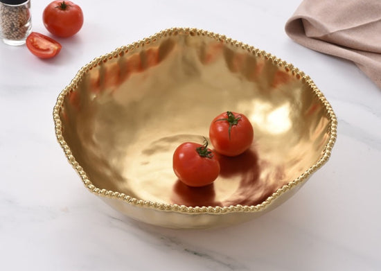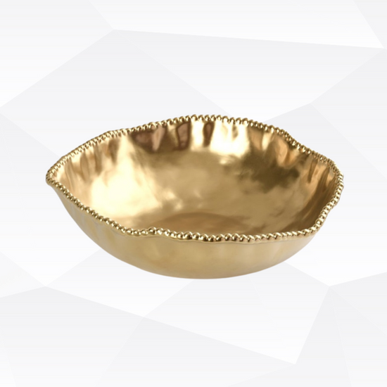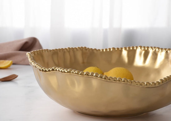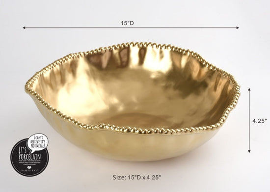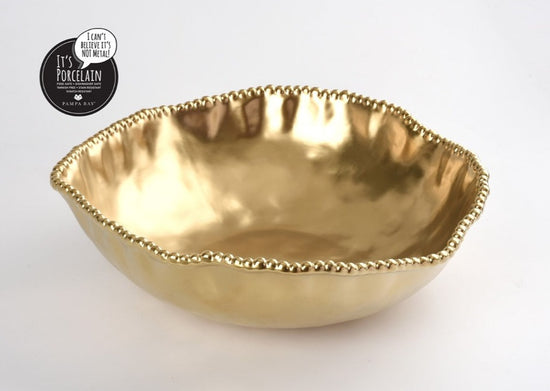 Oversized Serving Bowl in Monte Carlo. Perfect for your next dinner party or holiday! Roasted potatoes and veggies, spaghetti and meatballs or a simple salad serve up nicely in this beautifully crafted bowl. Crafted in a luxurious matte gold-toned high-fired porcelain with gold beads. Food safe. Dishwasher safe. Oven safe. Easy Care.