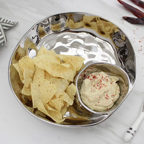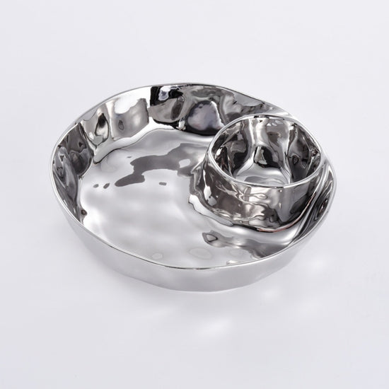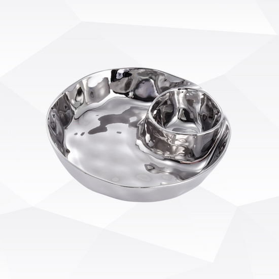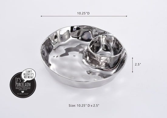 Introducing the Thin and Simple Round Chip and Dip—the ultimate multitasker for crudités with dressing, chips and dip, or a divine pairing of berries with cream (or chocolate!). Meticulously crafted in captivating silver-finished porcelain. Championing food safety, dishwasher and oven resilience up to 500°, and unbeatable resistance against tarnishing and staining. Effortless maintenance meets bold sophistication!