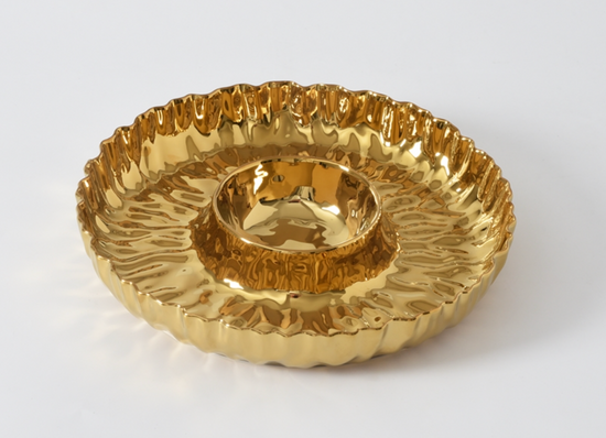 Chip and Dip in Gold. Perfect for any dip combo : hummus and pita, salsa and tortilla chips, veggies and ranch or our favorite berries and whipped cream! Striking and elegant gold-tone finished high-fired porcelain. Food safe, tarnish free, dishwasher safe, oven safe to 500. Easy Care.