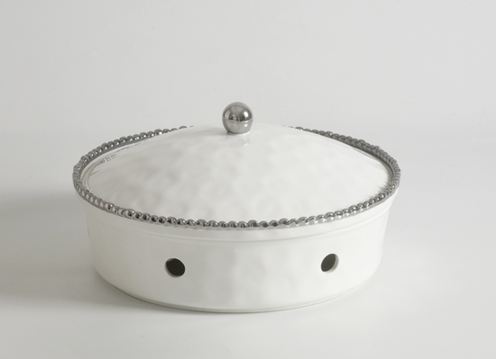 Keep meals warm for serving while presenting in style with our Round Chafing Dish from the Salerno collection. The porcelain baking trays can be warmed up with or without food in the oven and then placed on the Chafing stand over tea lights. The beautiful lid will help ensure that your food will stay hot until your family and guests are ready to enjoy. Gleaming white porcelain with lustrous silver beads. Food safe, dishwasher safe, oven safe to 500°. Tarnish and stain-free. Easy Care. Capacity: 1.5 Qt. Recommended: Three tea lights (not included) should provide sufficient heat. Do not put empty baking tray over the tea lights. It’s best to warm the food in the tray first and then add to the chafing stand.