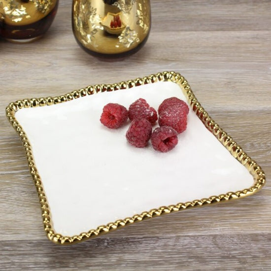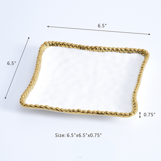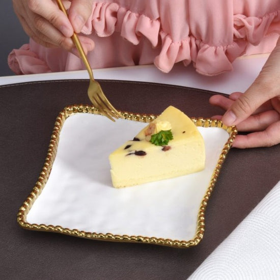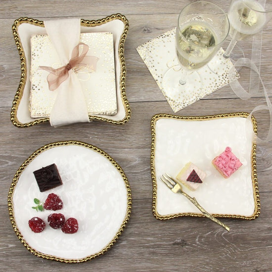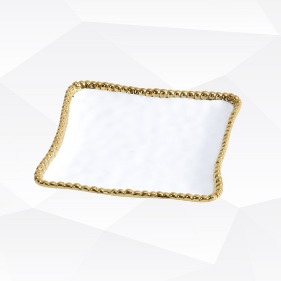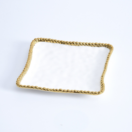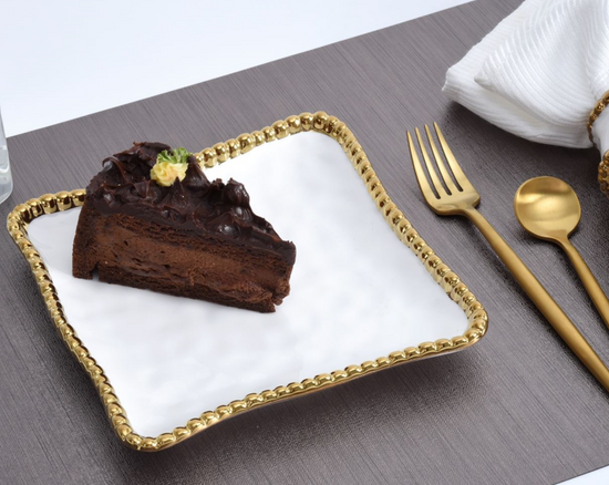 Introducing Golden Salerno – elevate your culinary game and presentation by showcasing delectable appetizers and pastries on these exquisite plates. Crafted from gleaming white porcelain adorned with lustrous gold beads in titanium, they're your ticket to wowing your guests with style and sophistication.