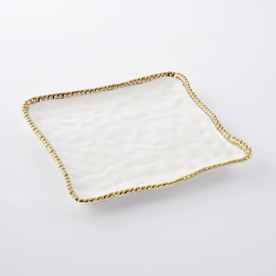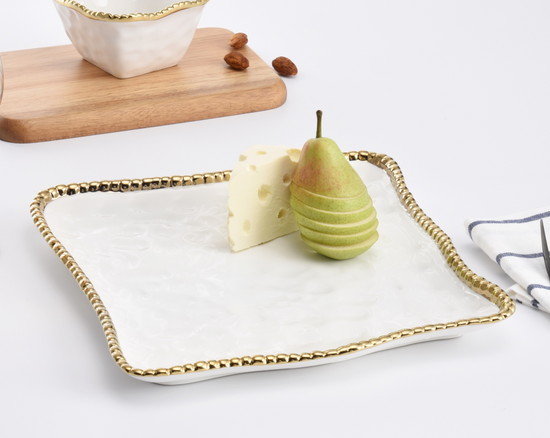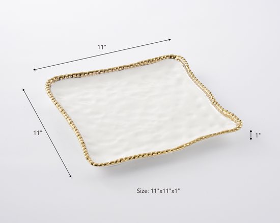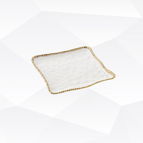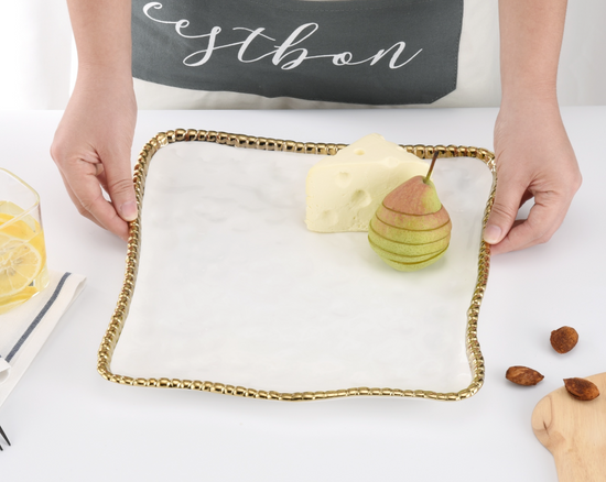 Square serving platter . Ideal for serving up your favorite appetizer or impressing dinner guests with a stunning dessert platter. You can even keep things warm in the oven right on the platter. Gleaming white porcelain with lustrous gold beads in titanium. Food safe. Dishwasher safe. Oven safe to 500°. Easy Care.