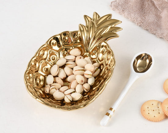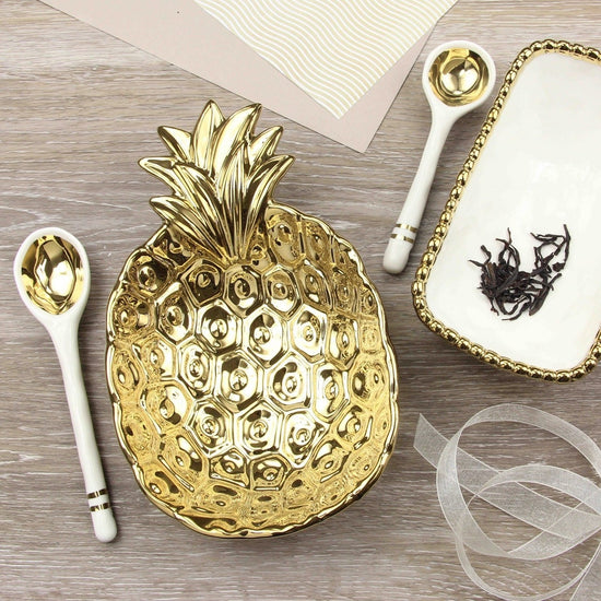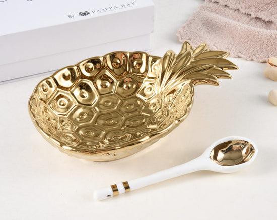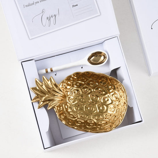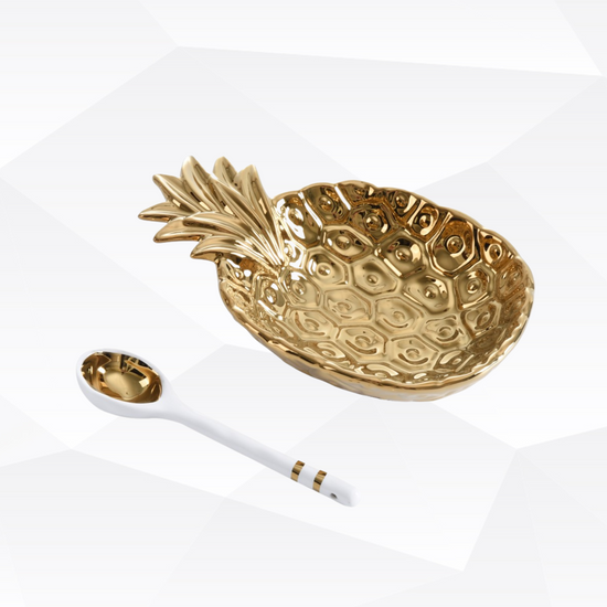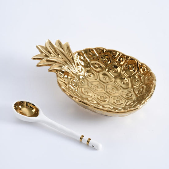 Add some sweetness to your life with our Pineapple set! Ideal for all gifting occasions or to gift to yourself! Beautifully packaged in a gift box with a fun sentiment on the inside cover that can be personalized.? Bowl in stunning gold tone titanium finished porcelain and spoon made in white porcelain with gold accents.