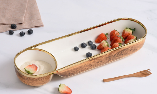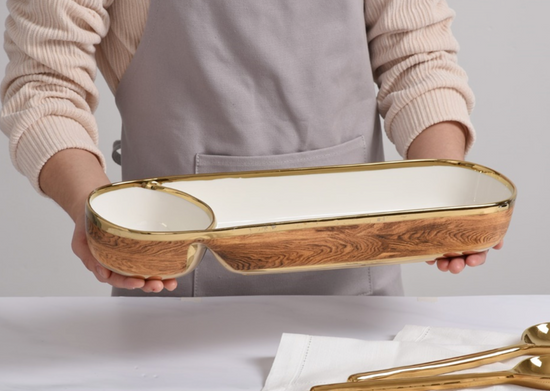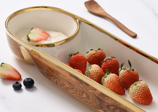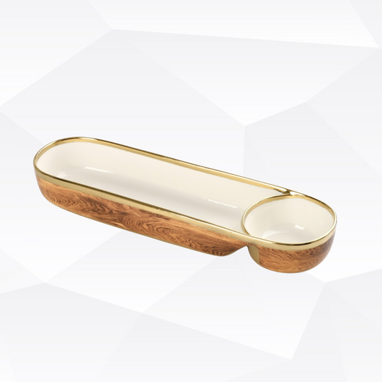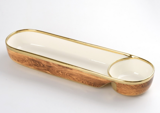 Chip and Dip from our Madera Collection. Perfect for any dip combo ? hummus and pita, salsa and tortilla chips, veggies and ranch or our favorite berries and whipped cream! This piece also makes a stunning display for sushi and soy sauce or crab cakes and tartar sauce. Stunning high-fired porcelain with a rustic wood design and gold-toned rim. Food safe, tarnish free, dishwasher safe, oven safe. Easy Care.
