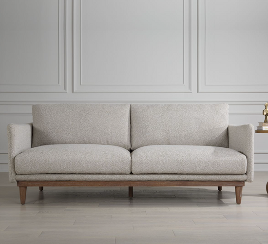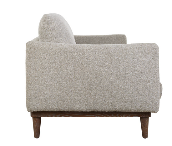 Experience ultimate comfort with this inviting boucle sofa. Designed with clean, modern lines, it rests on a solid oak base finished in a rich walnut with a subtle gray cerused effect. The high-density foam cushions are Dacron-wrapped for added softness and upholstered in a warm, Performance textured beige boucle, offering both style and sink-in comfort.