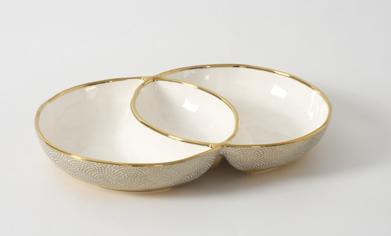 3 Section Server. Perfect for a favorite combos of dips, sauces, chip, or fruit and vegetables. Beautifully crafted in a stunning white porcelain with gold detail. Inspired by the beauty and unique shape of the Japanese folding fan called Sensu. Food safe, tarnish free, dishwasher safe. Great wedding gift as they look like 2 rings intersecting!