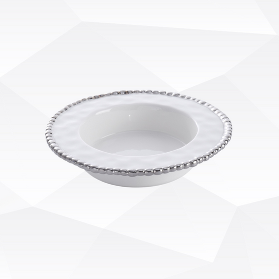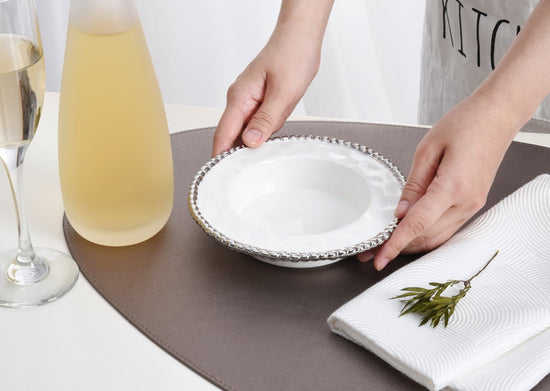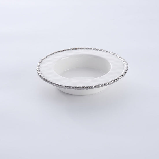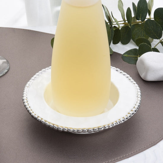 Wine bottle coaster with cork insert in Salerno. Great to give as a gift alone or with a bottle of wine! Every home needs at least one of these gorgeous and practical coasters. Perfect for wine bottles and water bottles, this coaster will prevent drips or condensation from running onto your table! Gleaming white porcelain with lustrous silver beads in titanium.